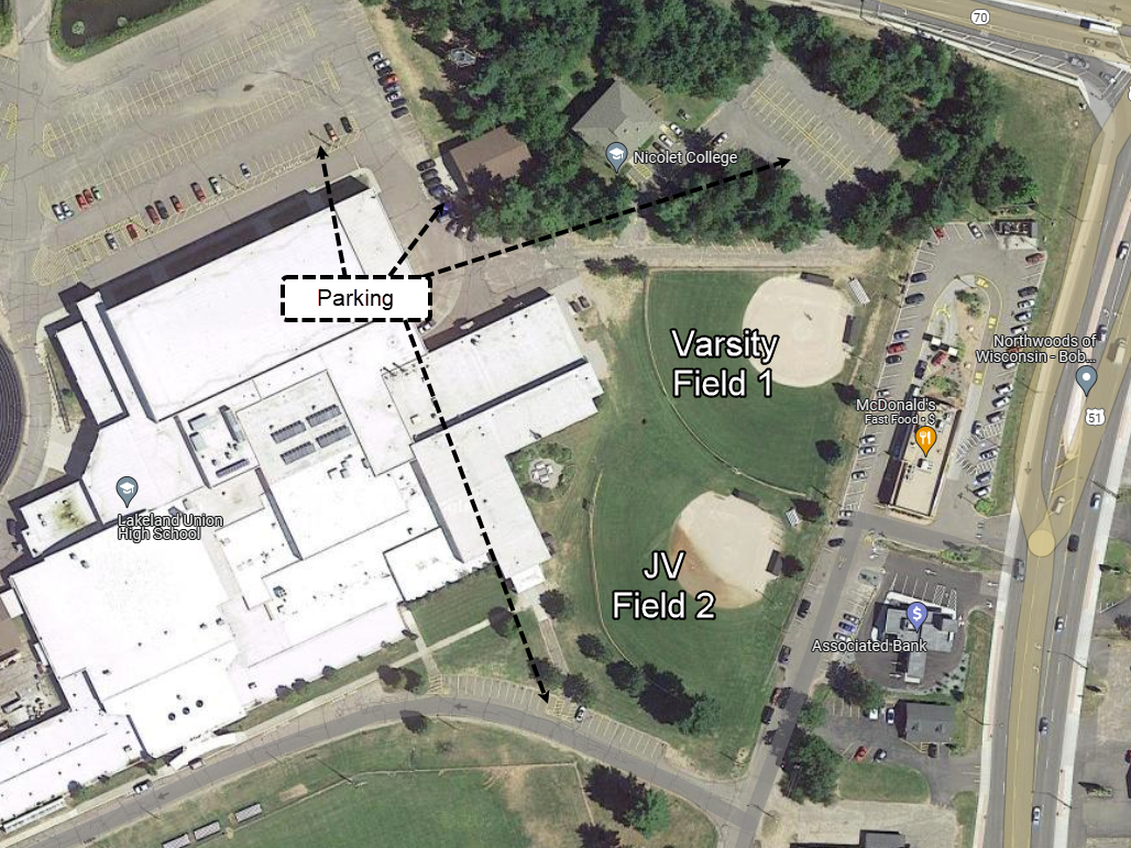 The Lakeland Fields are located at the Lakeland Union High School at 9573 WI-70, Minocqua, WI 54548 just behind McDonalds and Associated Bank. Parking is available either on the north side of the Varsity field (1) or the south side of the JV Field (2).