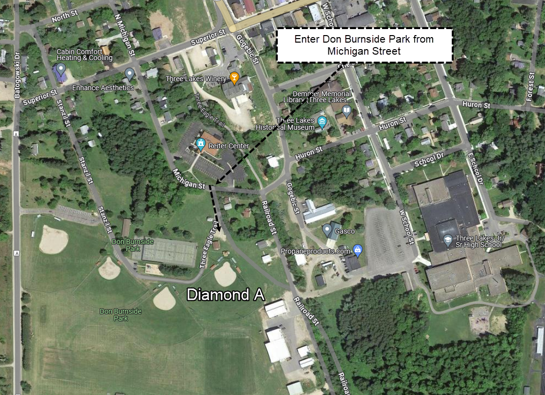 Softball plays on the A Diamond. The easternmost ball diamond in Don Burnside Park. Enter the parking area from Michigan Street.
