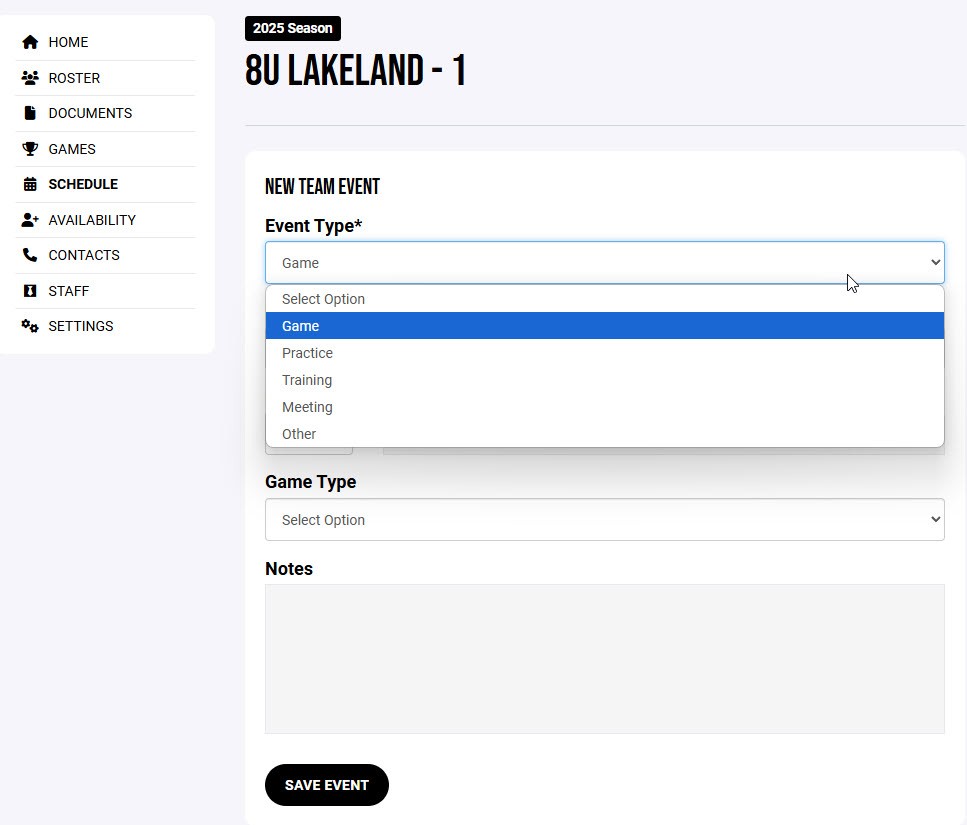 - Schedule & Games: Create, view, edit, and cancel team events.
