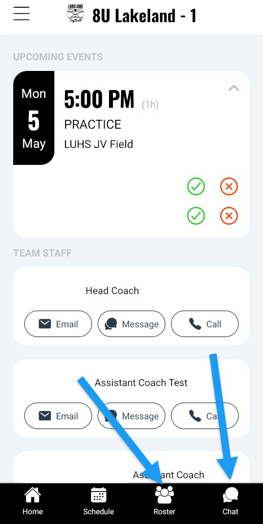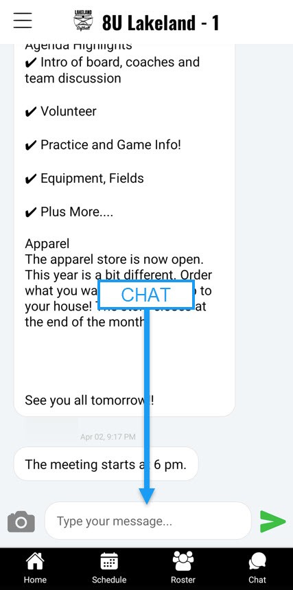 Team Chat – Tap the chat icon on your team page to send instant messages to families. (This is team specific communication)