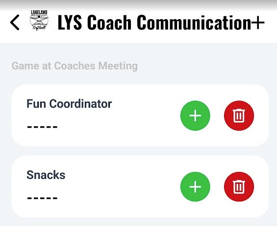 - Staff: Manage your teams staff (Head Coach, Assistant Coach, Manager, Other). All staff of youth sports must have a signed code of conduct. Visit https://www.lakelandyouthsoftball.com/coaching-resources/coach-volunteer-application/89366.