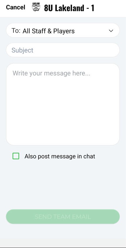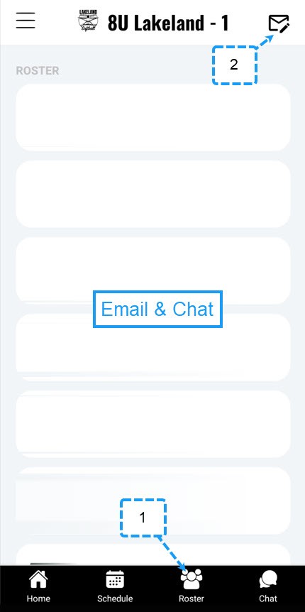 Email – Go to the team roster and tap the email icon to message individuals, families, or the whole team. (This is team specific communication)