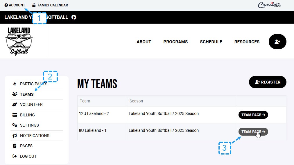 Log in at www.lakelandyouthsoftball.com and select your team from the dashboard.